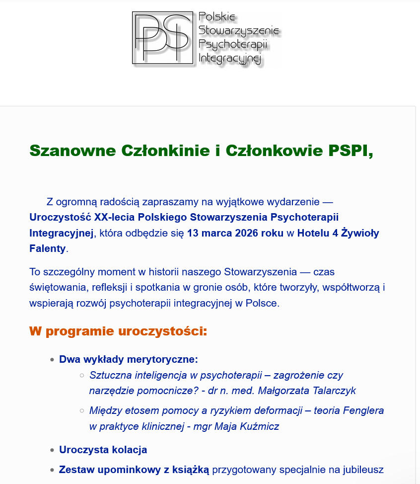W imieniu Zarządu Polskiego Stowarzyszenia Psychoterapii Integracyjnej: