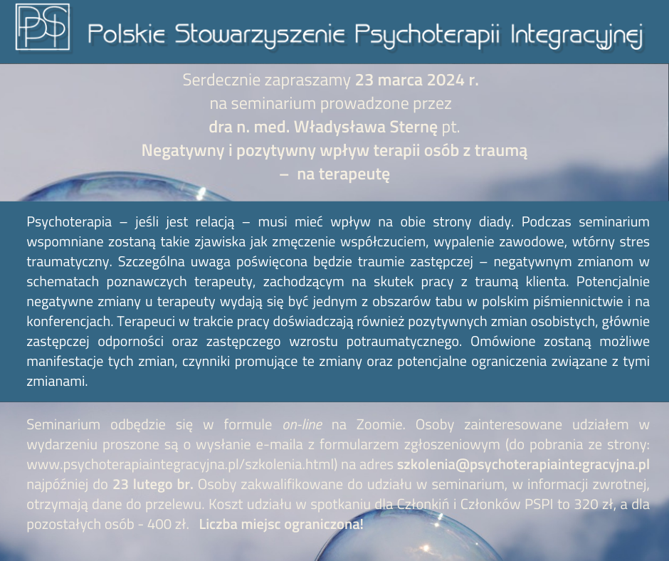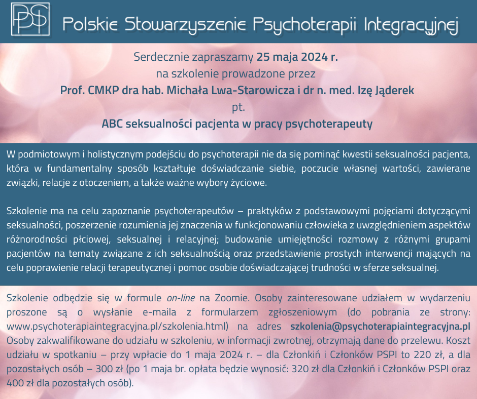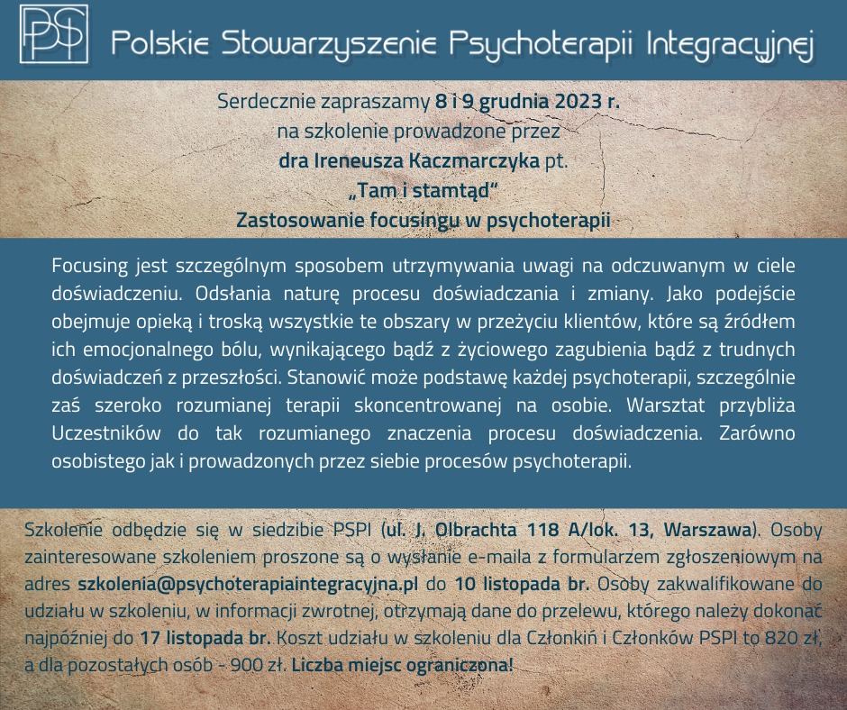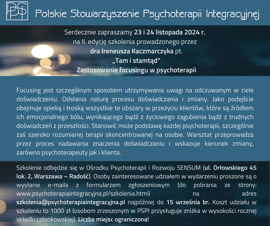 Będziesz miała/miał możliwość poczuć, co znaczy mieć głęboki KONTAKT ze sobą. Spojrzysz na swoje CIAŁO i symptomy z innej perspektywy. Będąc Terapeutą wiesz, jakie znaczenie ma SŁUCHANIE JĘZYKA SWOJEGO CIAŁA, gdyż w jego SIECIACH WSPOMNIEN ZAPISANA JEST TRAUMA. Wiedza i doświadczenia z zakresu pracy z ciałem wg analizy bioenergetycznej Alexandra Lowena zapewne wzbogacą Cię osobiście i zawodowo.